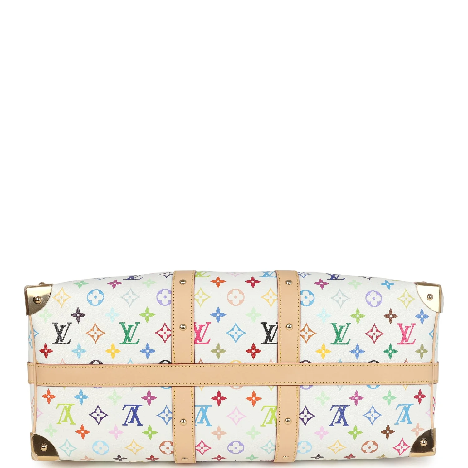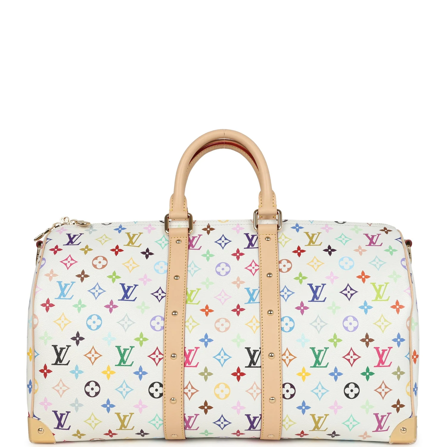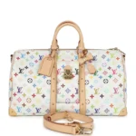 Own a piece of fashion history with this Louis Vuitton x Takashi Murakami Keepall Bandoulière 45 in the iconic white multicolored monogram. Crafted in coated canvas with gold-tone hardware, this rare collectible features a spacious interior, double leather handles, and a detachable strap for travel-ready convenience. A coveted collaboration that blends luxury craftsmanship with Murakami’s bold, colorful artistry.