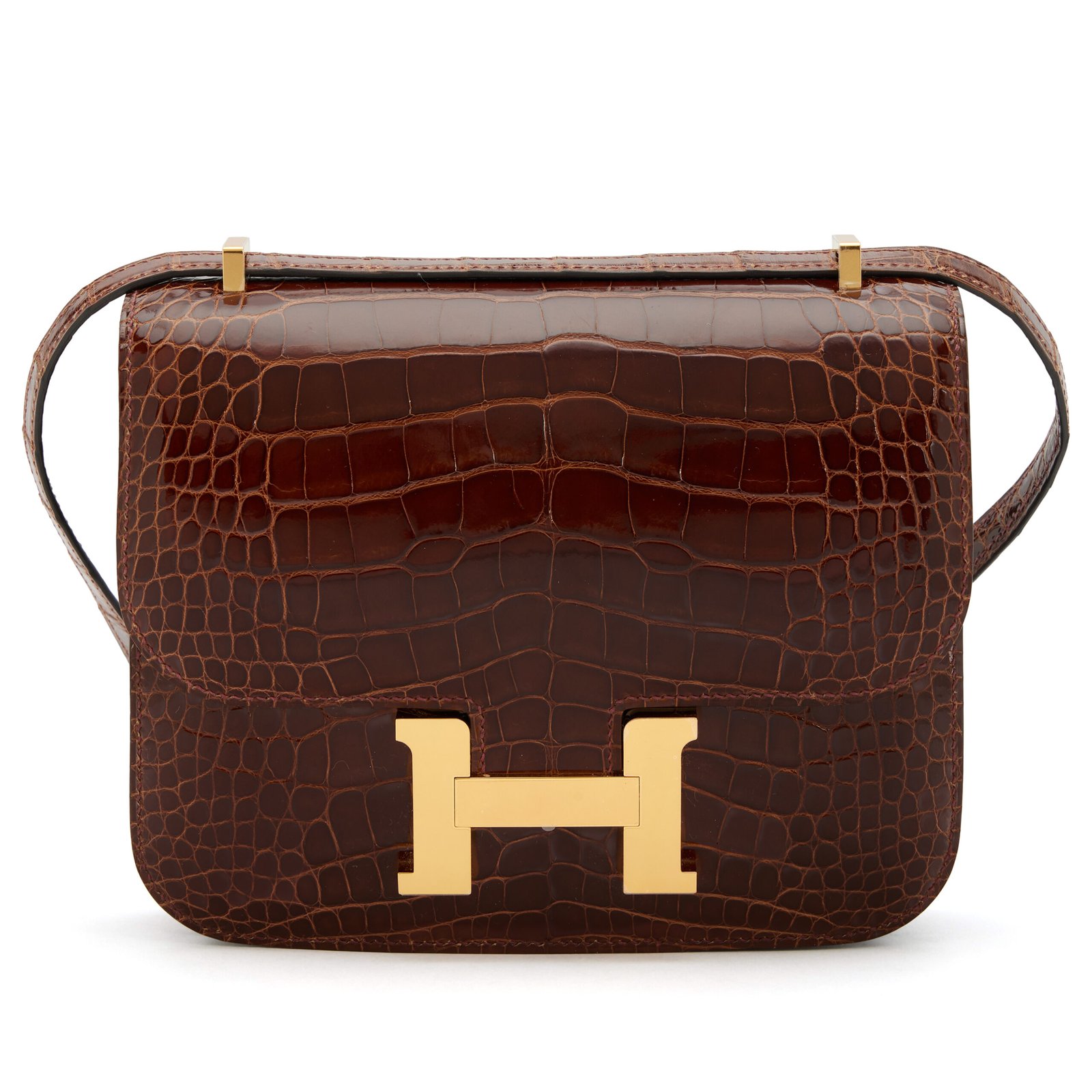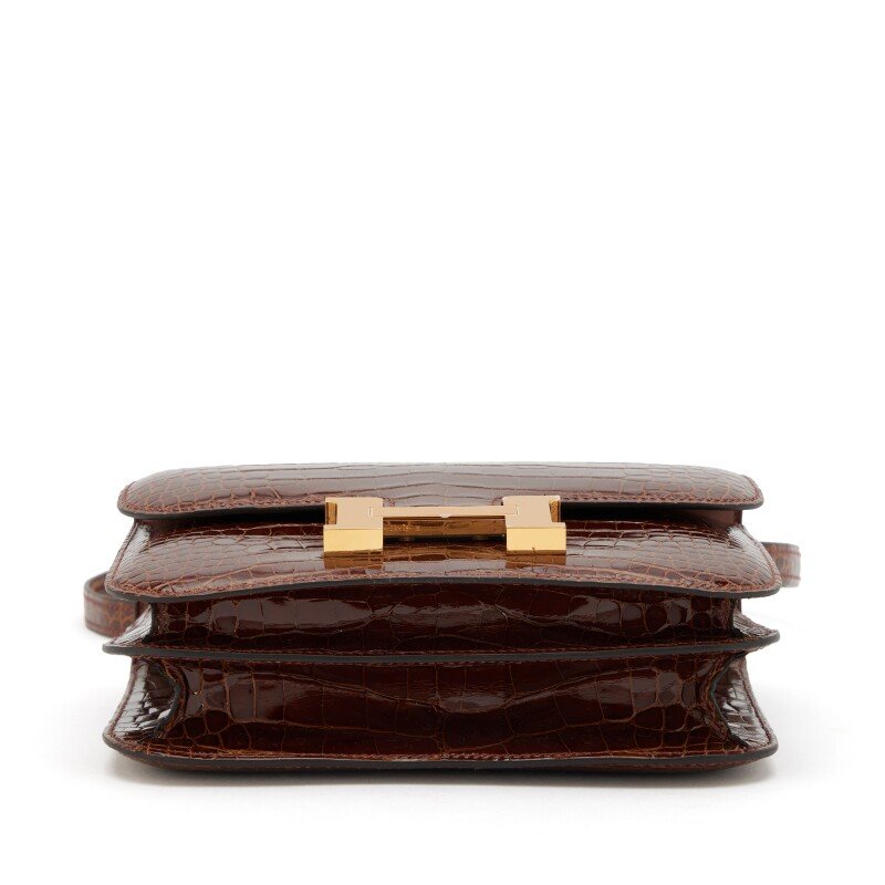 Home Hermès Handbags Constance Bags Miel Shiny Alligator Mini Constance 18 Gold Hardware, 2022