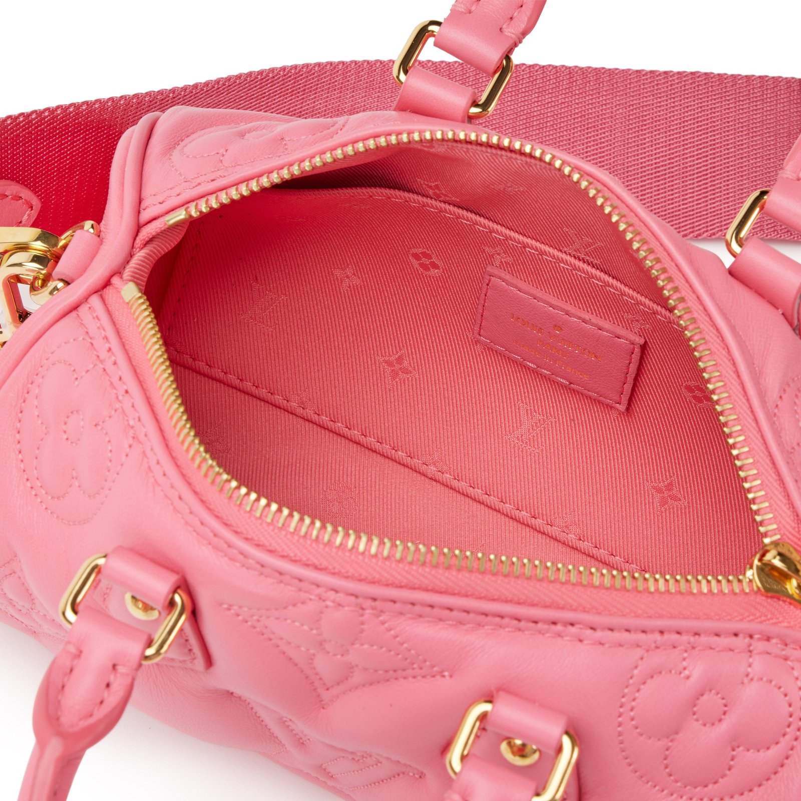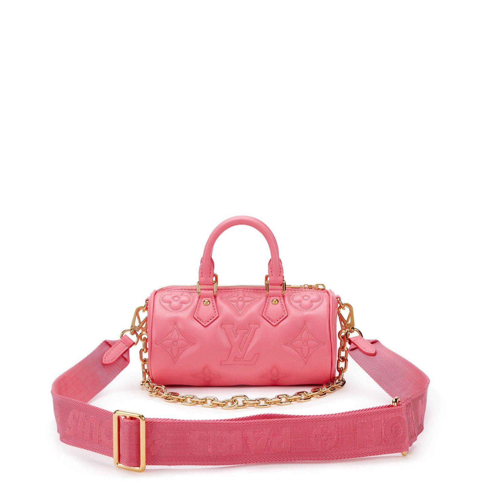 Louis Vuitton Pink Quilted Monogram Calfskin Bubblegram Papillon BB Gold Hardware, 2022. The interior is lined in a tonal monogram textile material. Includes metal strap, nylon strap, dust bag, and box