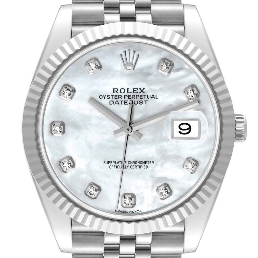 Rolex Datejust 126334 automatic 41mm men’s watch with mother-of-pearl dial, diamond hour markers, stainless steel and white gold case, and Rolex box. Classic and elegant timepiece.