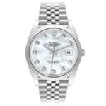 Celebrate timeless elegance with the Rolex Datejust 126334, a 41mm automatic men’s wristwatch crafted from stainless steel and white gold. Featuring a stunning mother-of-pearl dial with diamond-set hour markers, this model combines Rolex’s rich heritage with modern refinement. First introduced in 1945 as the world’s first self-winding chronometer with a date display, the Datejust remains an icon of precision and luxury.