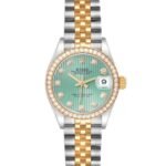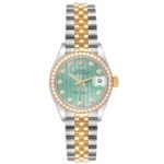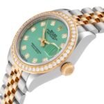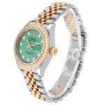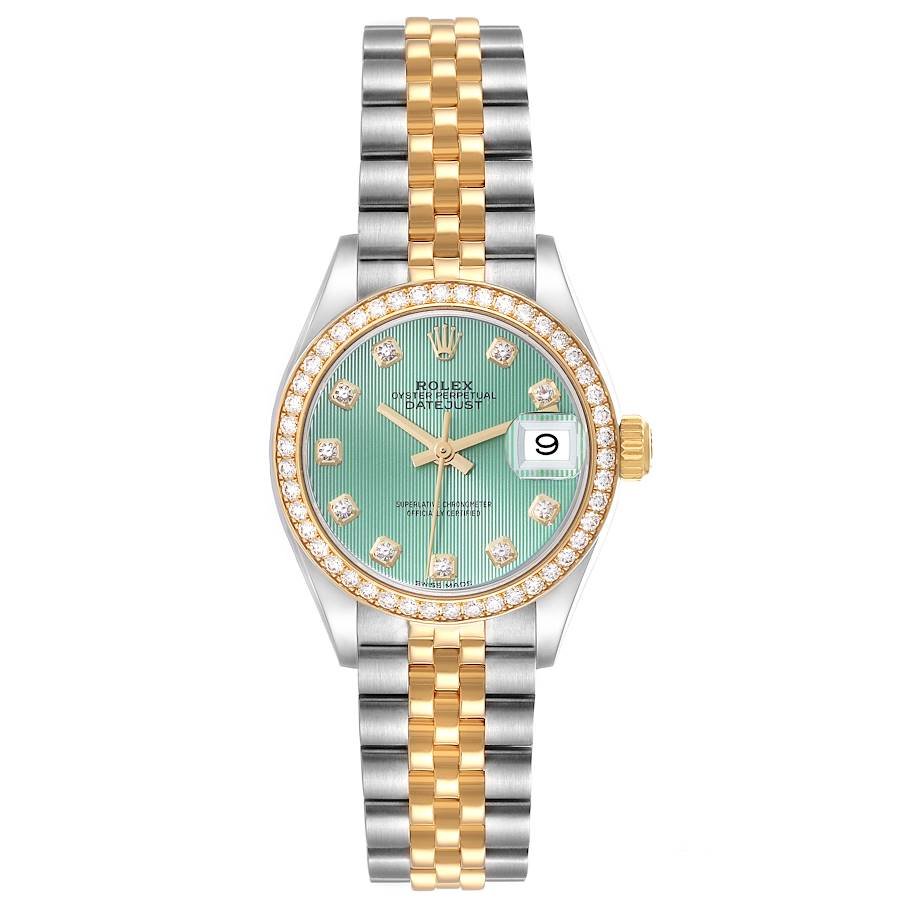 Rolex Datejust 279383 with diamond-set mint green dial and yellow gold/stainless steel Oyster bracelet. Automatic movement, 28mm case, date complication. In very good condition. Includes original Rolex box