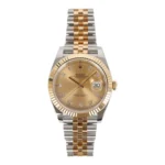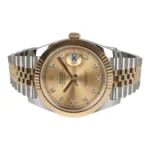 Rolex Datejust 41 Two-Tone Diamond Dial Watch for sale. It blends timeless design with modern craftsmanship. This two-tone model is adorned with factory-set diamonds, fluted bezel, and a cyclops lens over the date window. Designed for everyday wear with luxury in every detail.