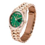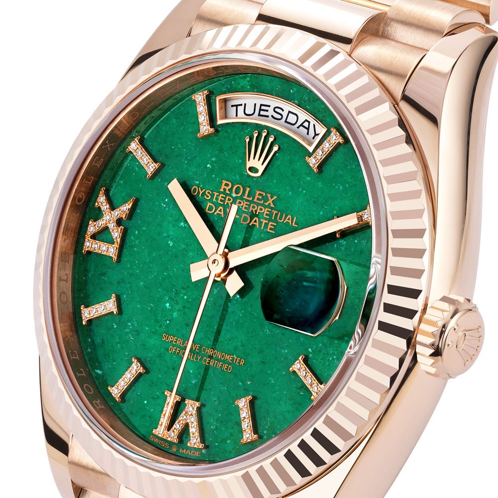 2024 Rolex Day-Date President with a green aventurine dial and diamond-set markers. Unworn, automatic movement, 36mm rose gold case, with full set (box & papers)