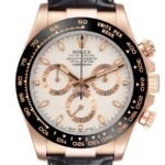 This model comes complete with its original Rolex box, warranty card, and service card. The 40mm rose gold case houses a beige/tan dial with elegant detailing, secured by a crocodile skin strap and rose gold deployant clasp. The movement is running at the time of listing, though not tested for precision.