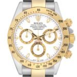 Elevate your collection with this Rolex Cosmograph Daytona 116523, a luxurious two-tone automatic chronograph wristwatch crafted in stainless steel and 18k yellow gold. Featuring a crisp white dial, screw-down case back, and deployant buckle, this timepiece embodies the iconic Daytona design. Originally produced circa 2003–2004, the watch comes in very good condition with minor signs of wear consistent with age.