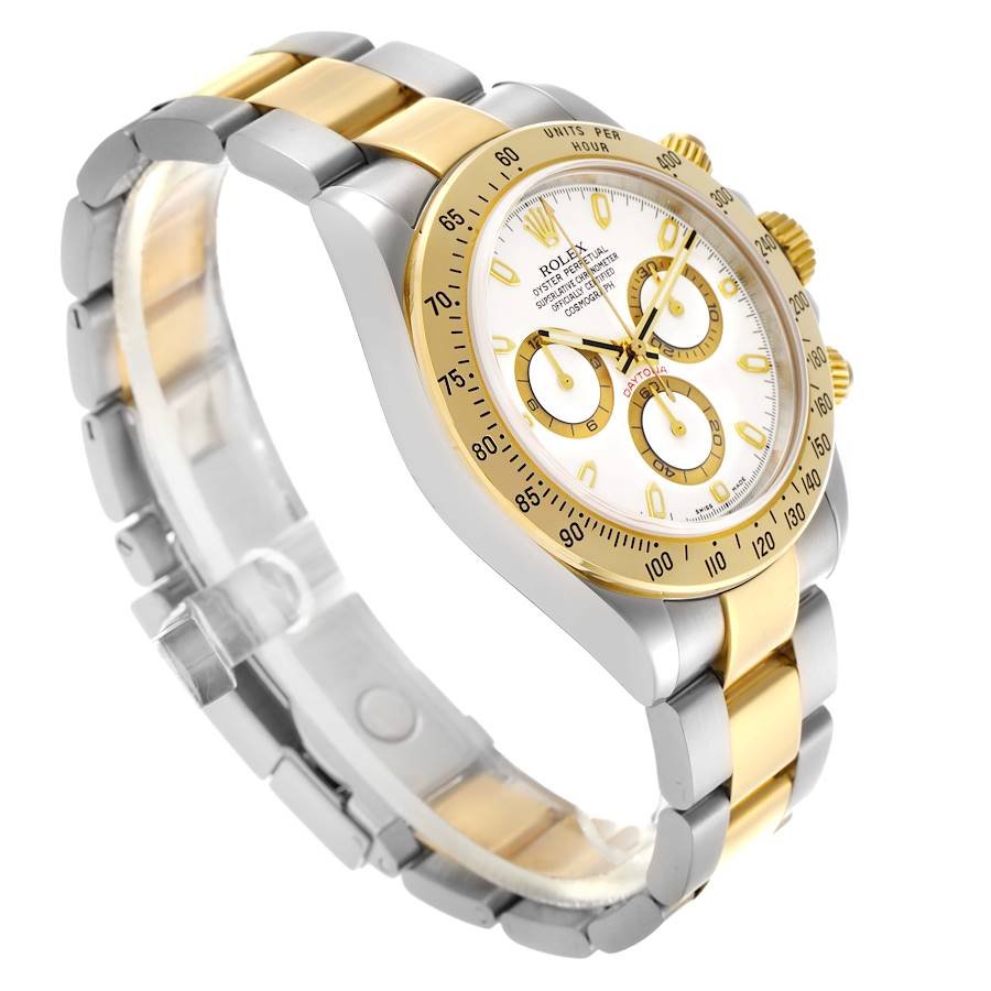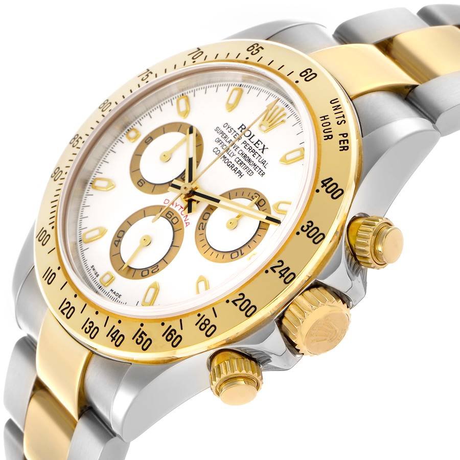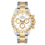 Two-tone Rolex Daytona automatic chronograph with white dial and yellow gold/stainless steel bracelet. 40mm case. Comes with box