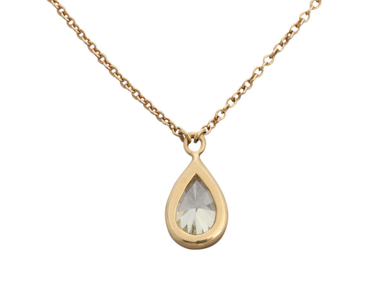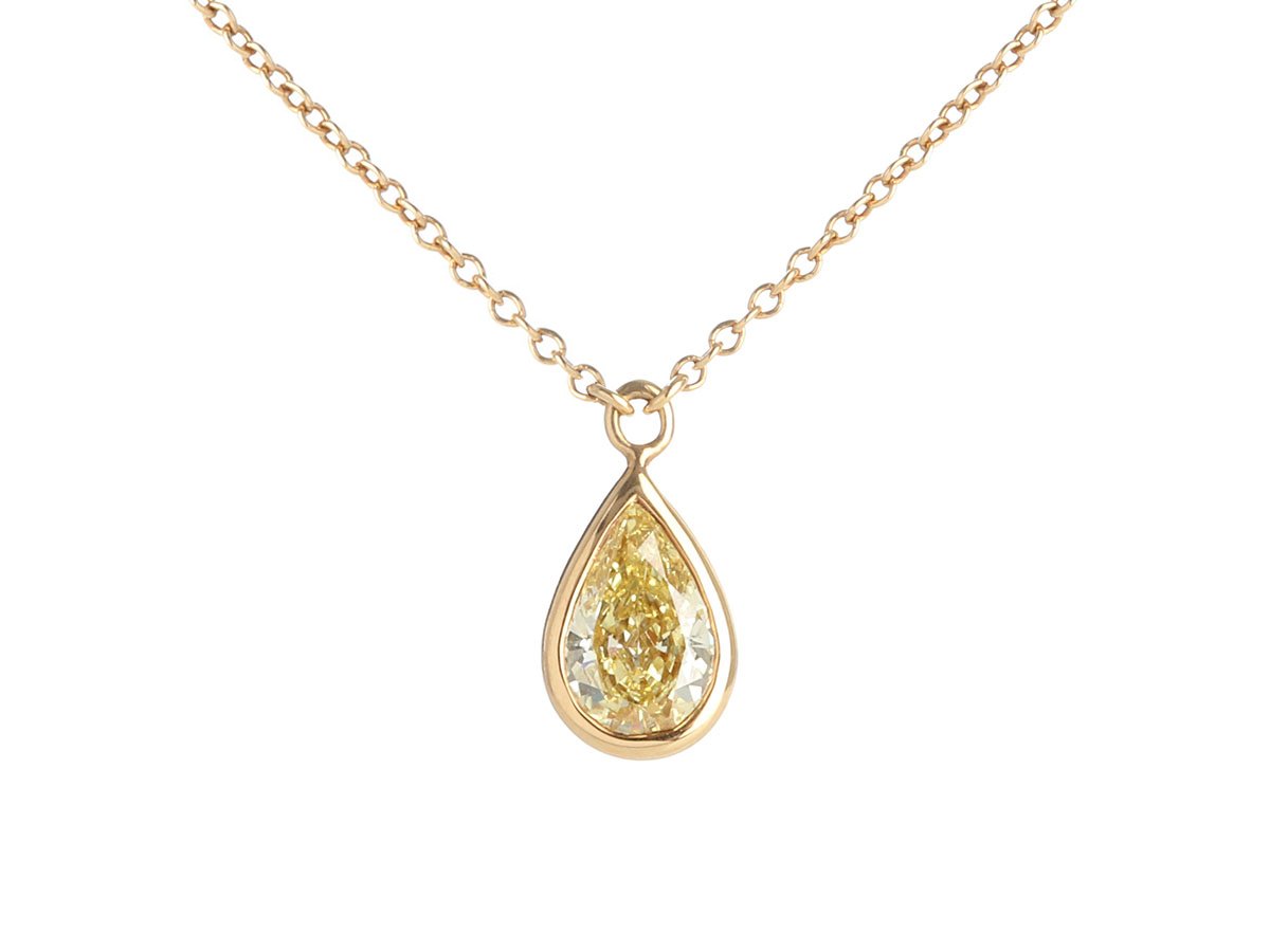 Elegant and timeless, this Tiffany & Co. pendant necklace features a 0.72ct pear-cut Fancy Intense Yellow diamond set in luxurious 18k yellow gold.