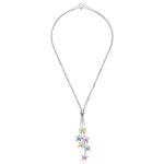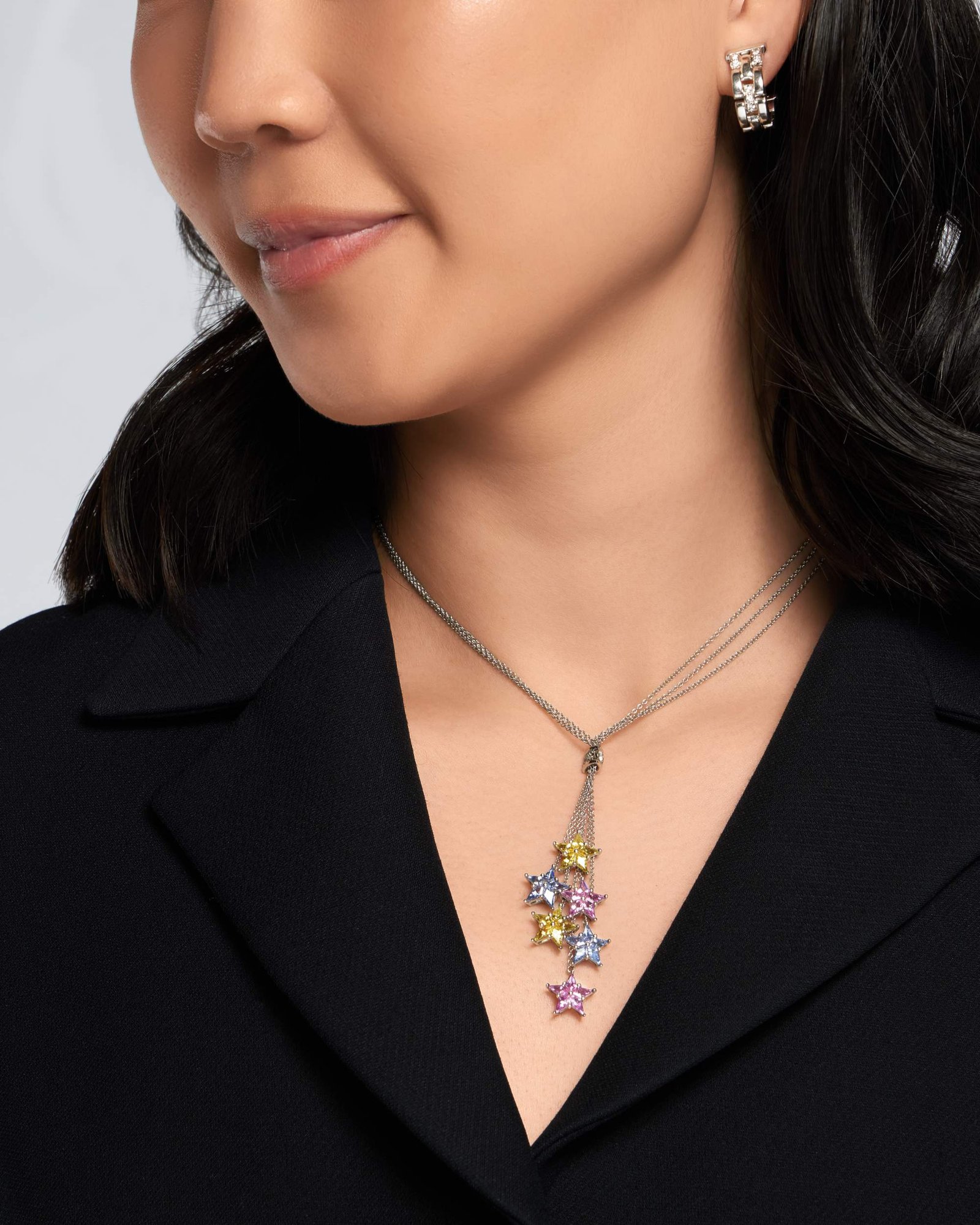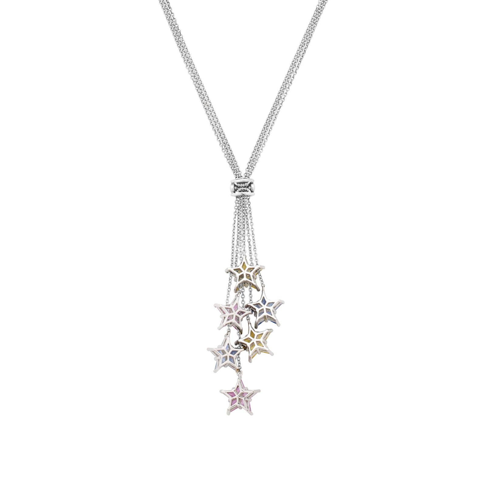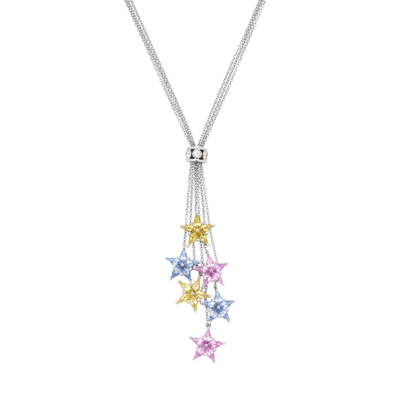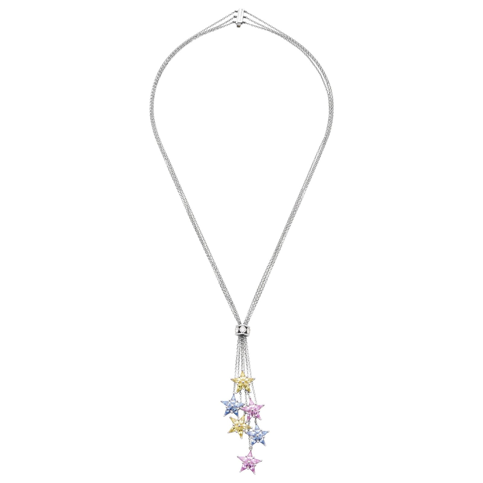 Elegant and rare Tiffany & Co. lariat necklace crafted in platinum, showcasing a dazzling array of multicolored kite-shaped sapphires — blue, pink, and yellow — arranged like stars and accented with round brilliant cut diamonds. The vibrant sapphires total approximately 4.80 carats, while the diamonds weigh approximately 0.15 carat. This luxurious piece weighs 17.37 grams and measures 15 inches in length with a 2¾-inch drop and ¾-inch width. Perfect for cocktail parties, evening events, or special occasions. Signed Tiffany & Co. and accompanied by a signed folio. Final sale item.