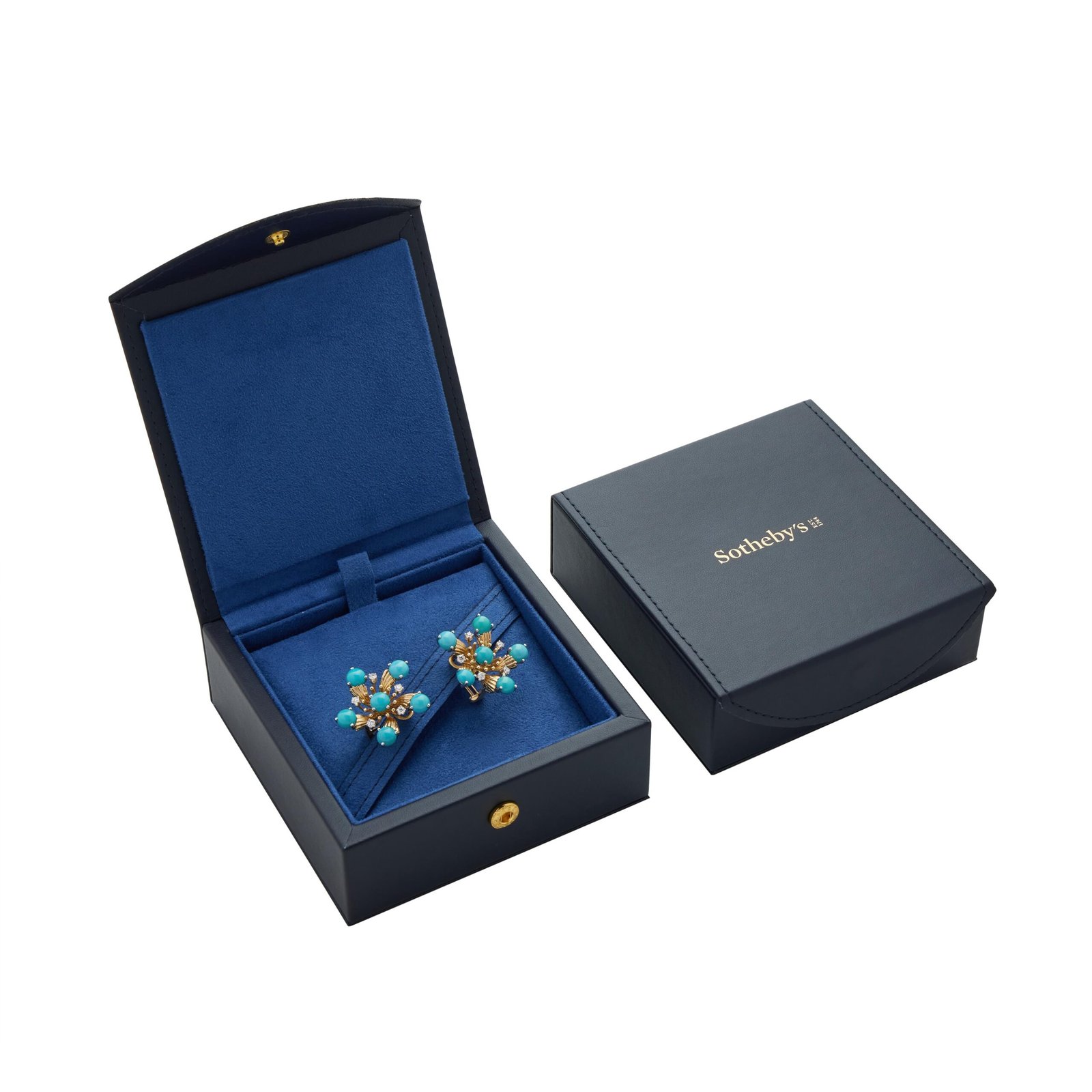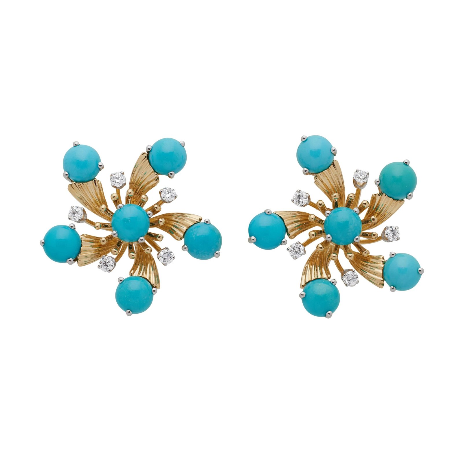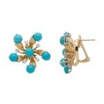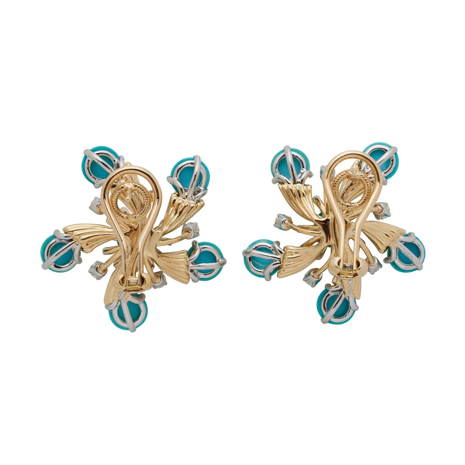Luxurious Tiffany & Co. earclips in 18k gold and platinum with turquoise cabochons and brilliant diamonds. A refined choice for women’s evening and cocktail wear