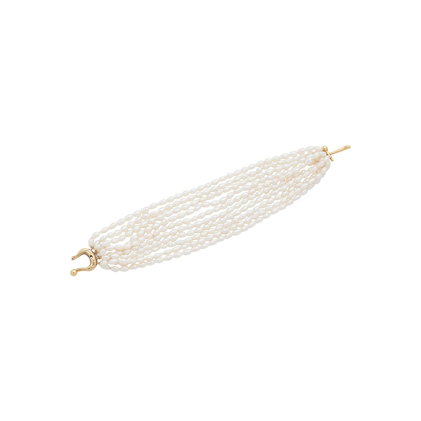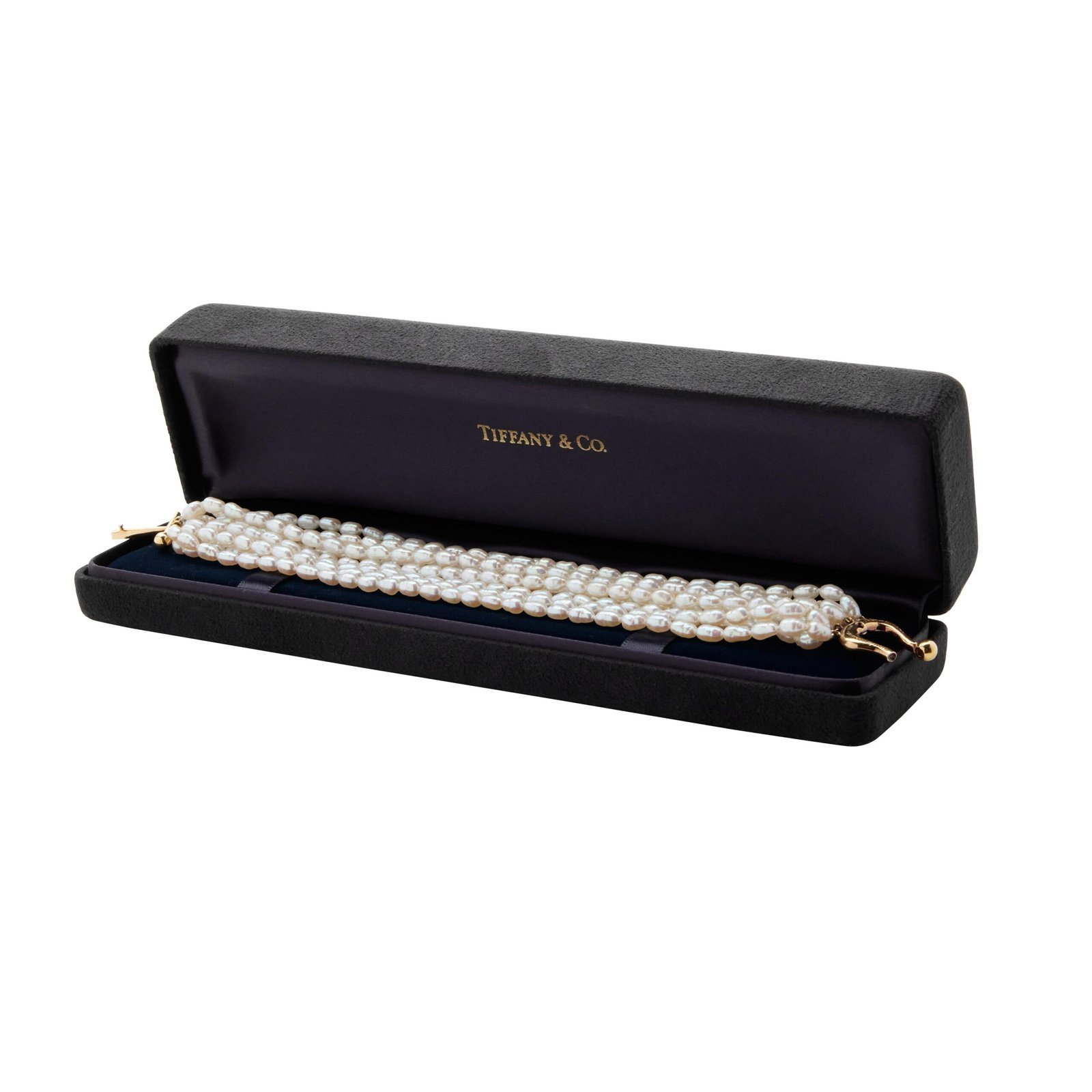 Elevate your jewelry collection with this rare Tiffany & Co. vintage multistrand bracelet, designed by Paloma Picasso. Crafted in 1981, this elegant piece features ten strands of luminous cultured pearls measuring 6.00 x 4.00 mm, secured by an 18k yellow gold clasp.