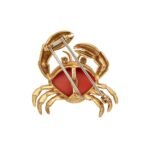 Vintage Tiffany crab brooch crafted in 18K gold with a 20mm coral cabochon and diamond-accented eyes. A playful and rare designer pin for both men and women. Final sale