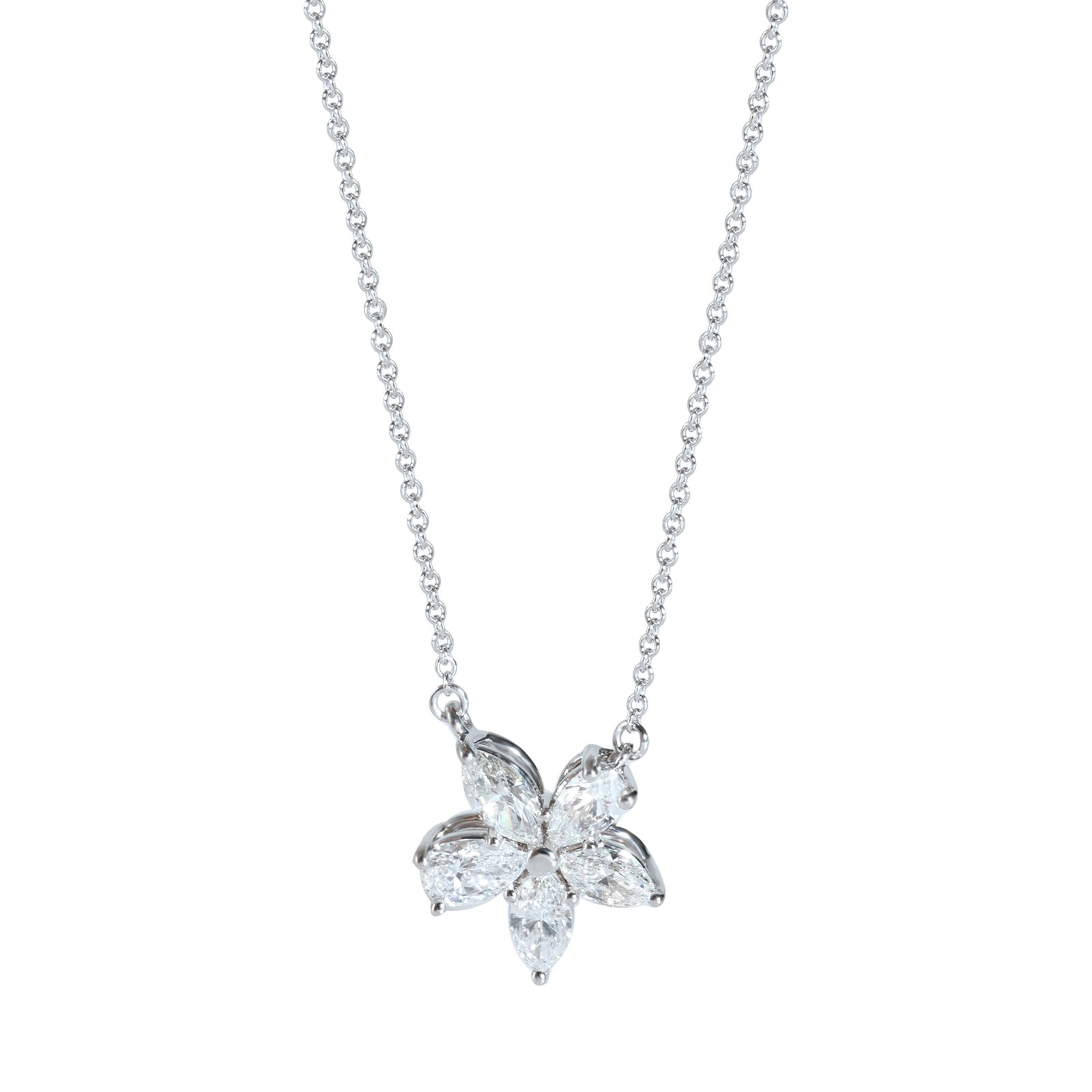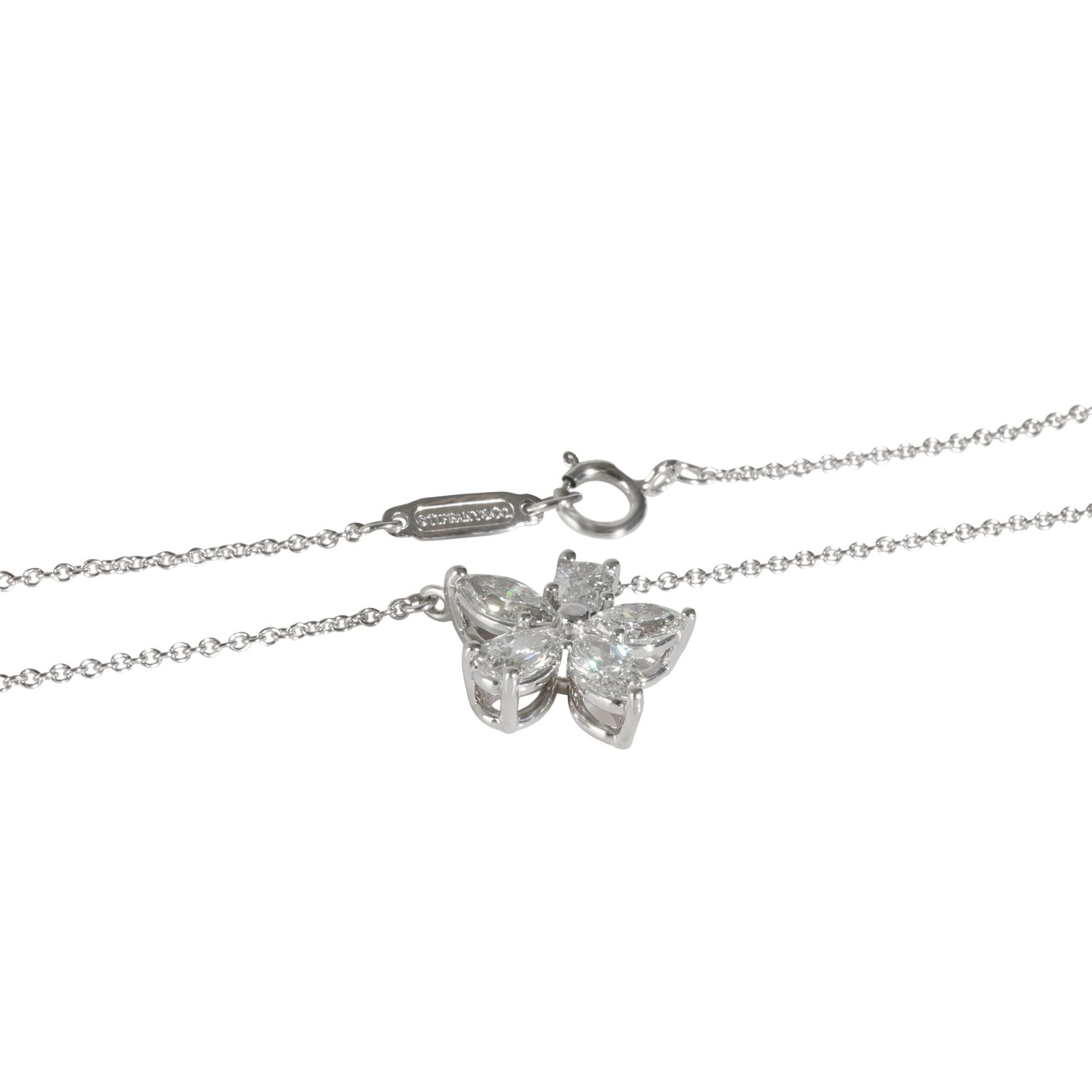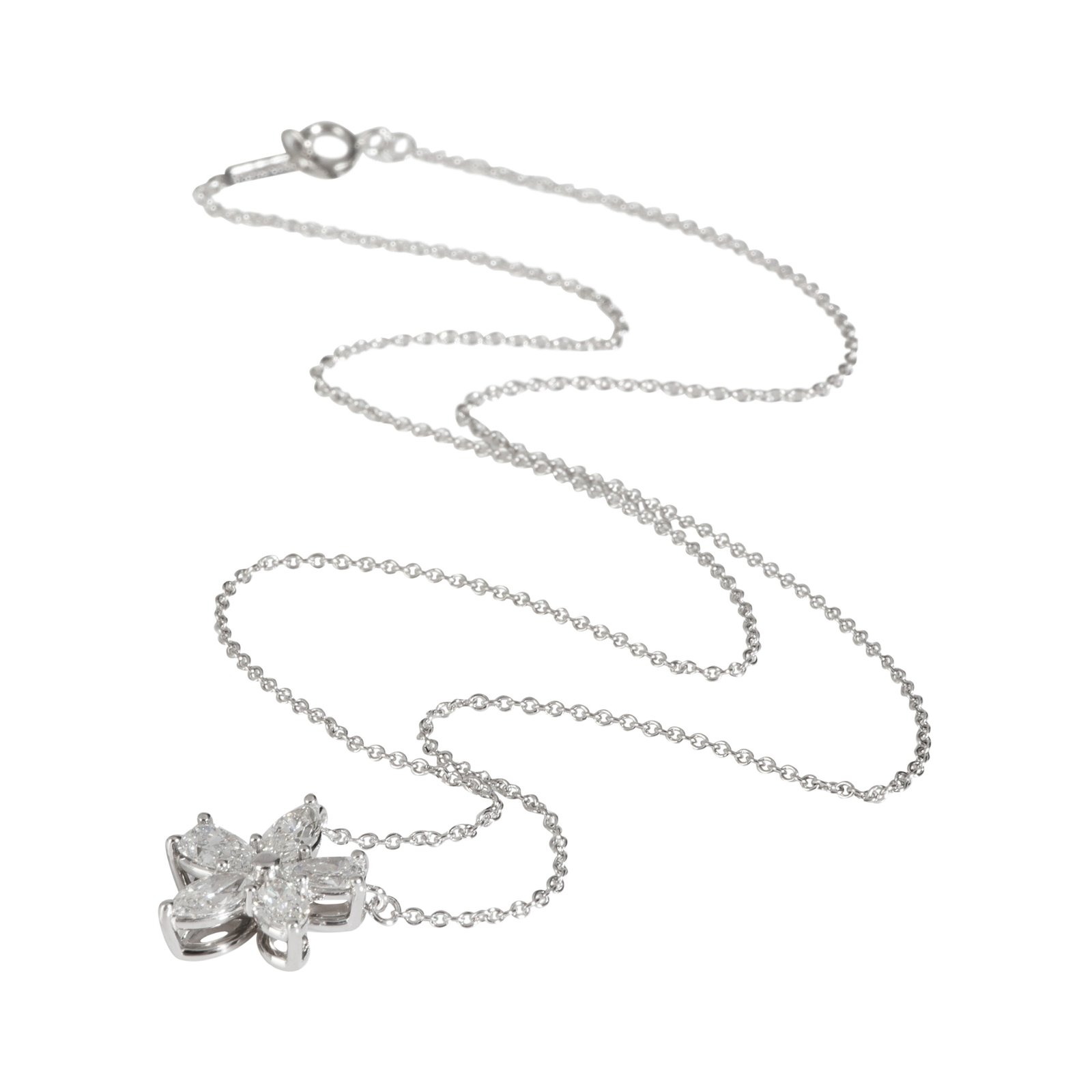 Timeless elegance from the iconic Tiffany & Co. Victoria collection. This platinum pendant necklace showcases a stunning cluster of 3 marquise-cut and 2 pear-cut diamonds totaling approximately 0.88 carats. Crafted in premium Platinum 950 with F–G color and VVS2–VS1 clarity diamonds, it’s the perfect blend of luxury and sophistication.