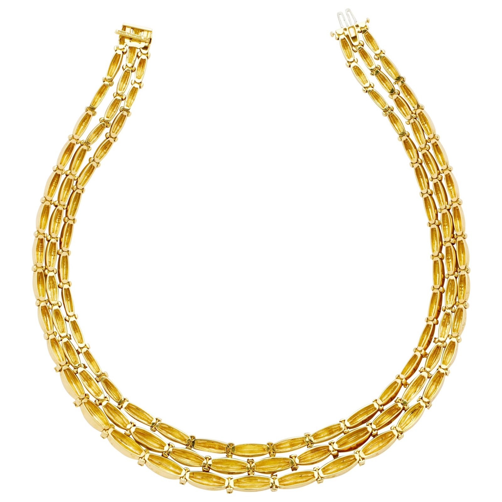 Signed Tiffany & Co. collar necklace in 18k yellow gold, circa 1992. Features approx. 3.75 ct F-G color VS1-VS2 clarity diamonds. 16″ long, 142.37g. Elegant and collectible vintage piece
