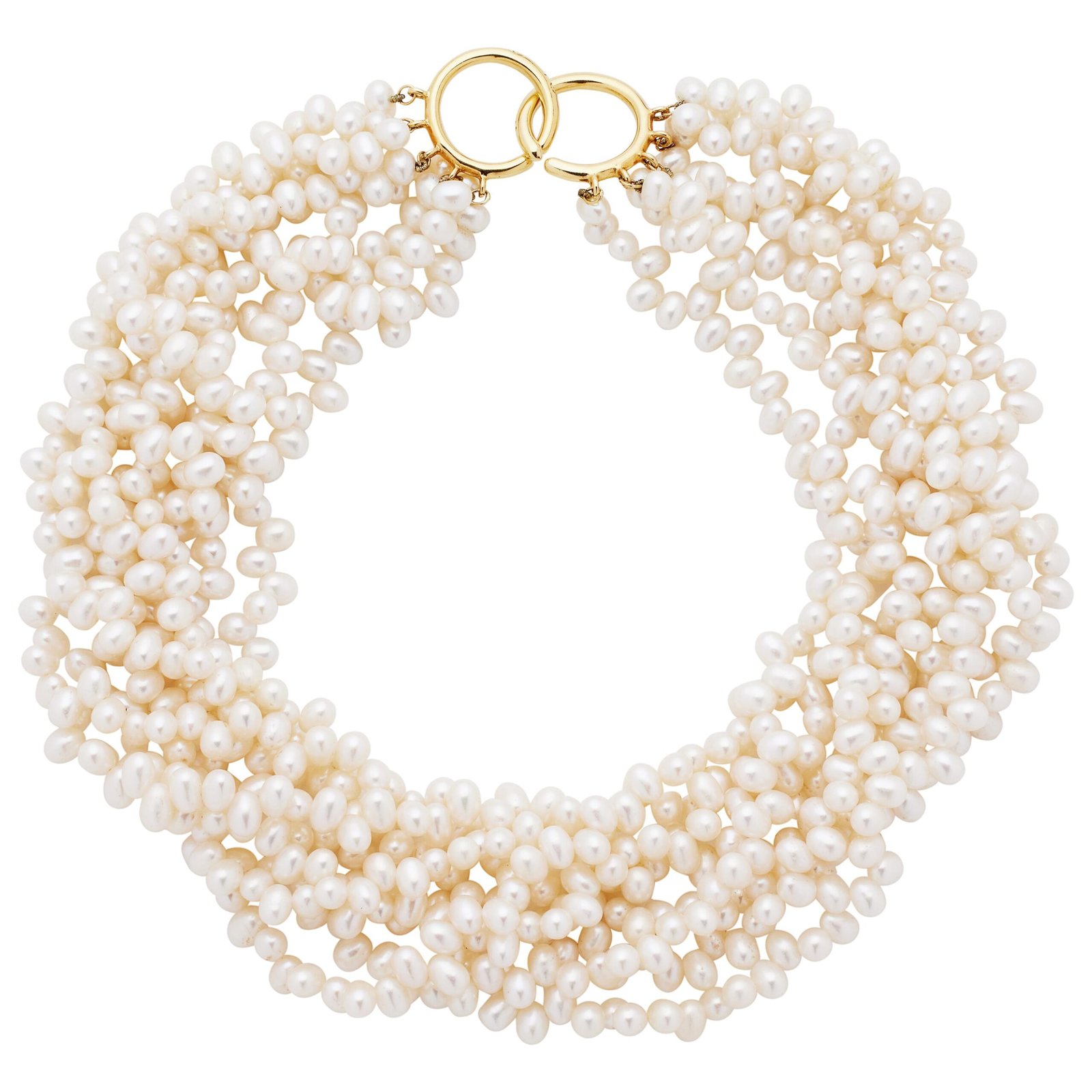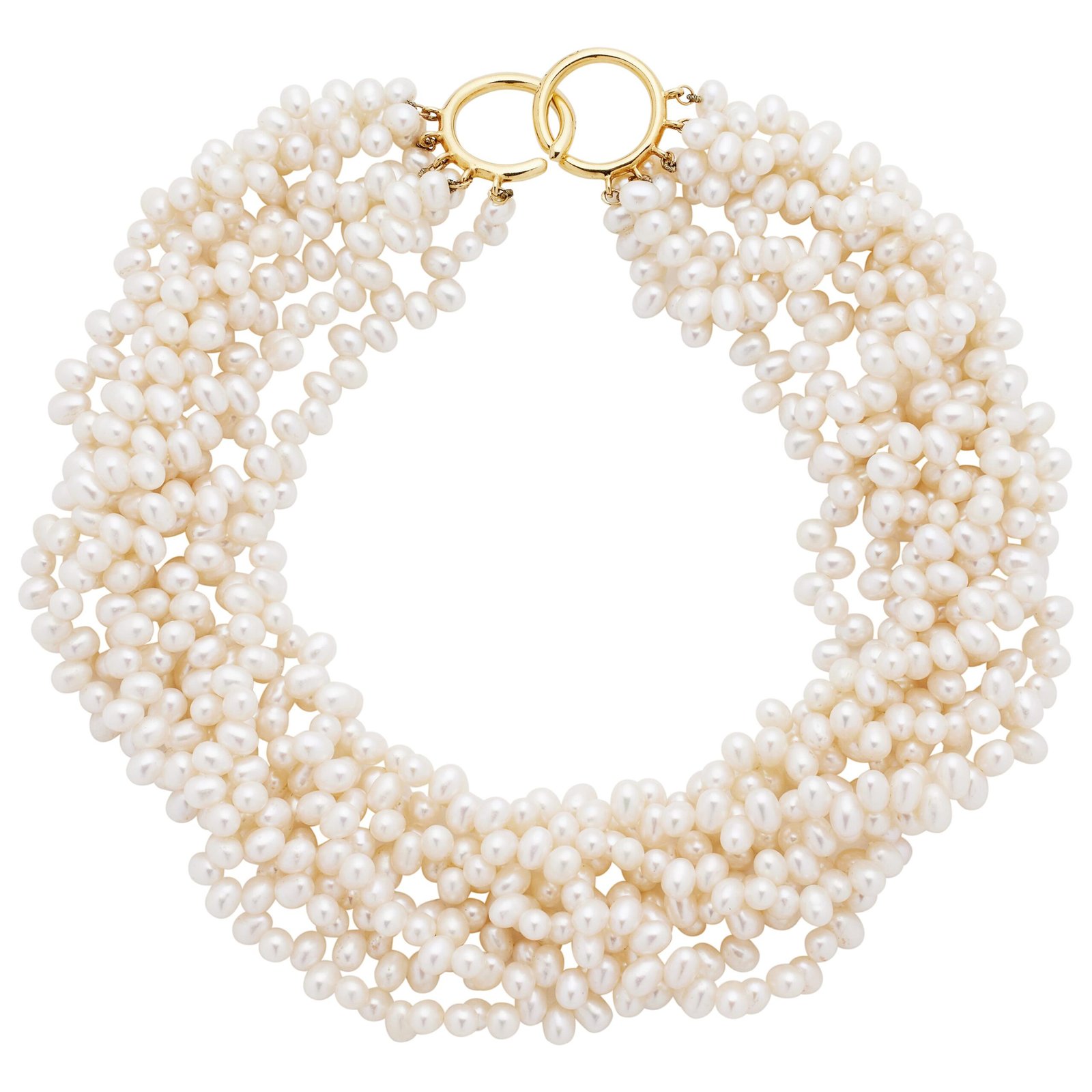 Discover timeless elegance with this vintage Tiffany & Co. multistrand collar necklace, designed by Paloma Picasso. Featuring eight luminous strands of 6.00 x 5.00 mm cultured pearls, this statement piece is finished with a distinctive 18k yellow gold interlocking clasp. Signed by Tiffany & Co., this 1980s classic combines luxury and heritage in one exquisite piece. Ideal for cocktail parties, evening events, and collectors of fine vintage jewelry.