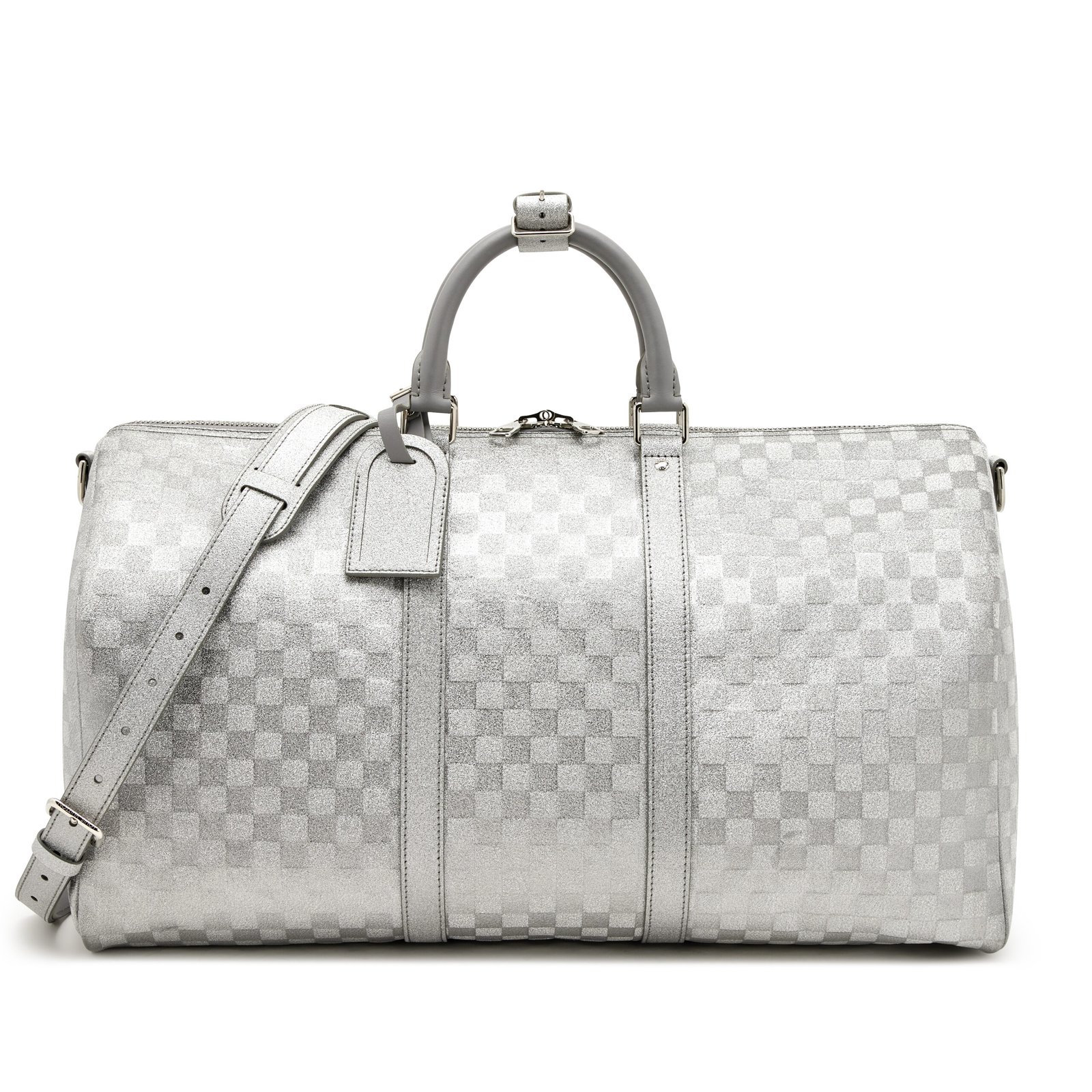 Louis Vuitton x Virgil Abloh Silver Glitter Damier Leather Keepall 50 Bandoulière Silver Hardware, 2022. The interior is lined in a grey textile material. Includes lock, two keys, lock dust bag, shoulder strap, luggage tag, shoulder strap dust bag, and dust bag.