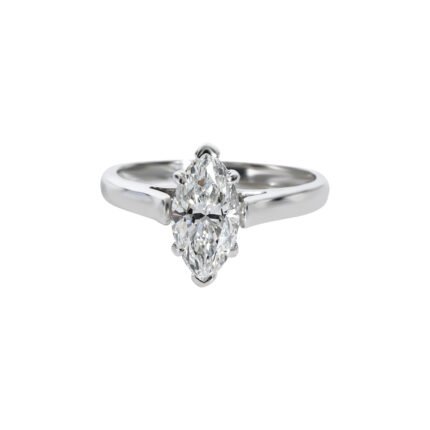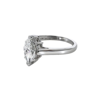 Tiffany & Co. platinum engagement ring set with a 1.22ct marquise cut diamond, E color, VVS2 clarity. Includes original Tiffany certificate. Ring size 5½. Classic bridal style