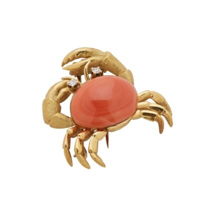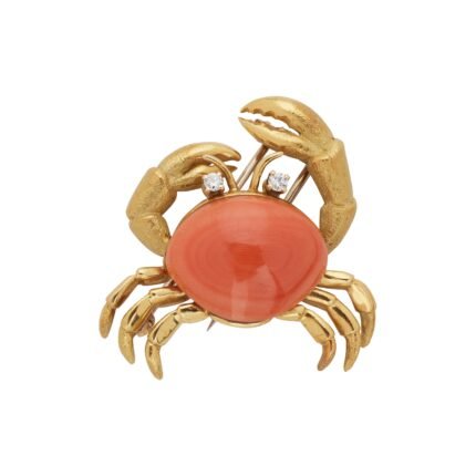 Vintage Tiffany crab brooch crafted in 18K gold with a 20mm coral cabochon and diamond-accented eyes. A playful and rare designer pin for both men and women. Final sale