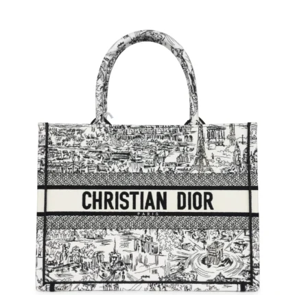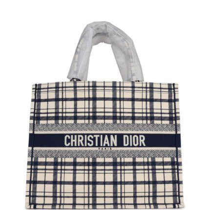 Authentic Christian Dior large Book Tote made from premium embroidered canvas, featuring signature design and roomy structure for versatile luxury wear